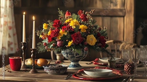 Naklejka premium Colorful Holiday Table Setting with Floral Arrangement