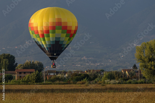 © Marco Taliani, Obraz premium Colorful hot-air balloon flies over typical village in the Tuscan countryside in the light of the sunset