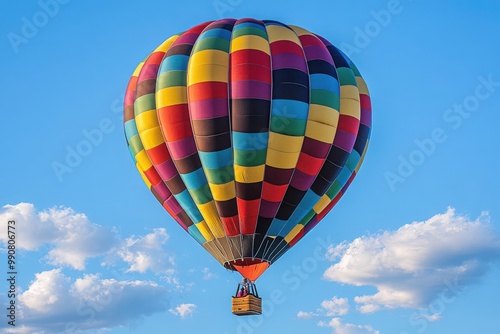 Fototapeta premium Colorful hot air balloon floating peacefully in a clear blue sky with fluffy...