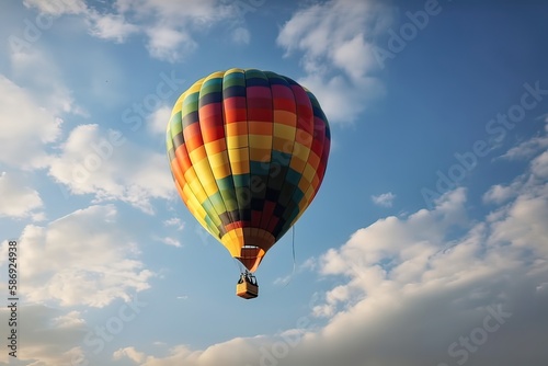 © Kowit, Naklejka premium Colorful hot air balloon flying on sky at sunset. travel and air transportation concept. Generative Ai.