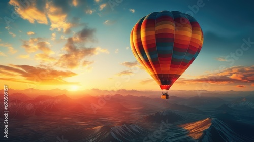 © Viktor, Fototapeta premium Colorful hot air balloon flying on sunset background. AI generated.