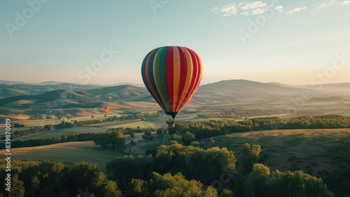Naklejka premium Colorful hot air balloon flying over scenic countryside at sunrise