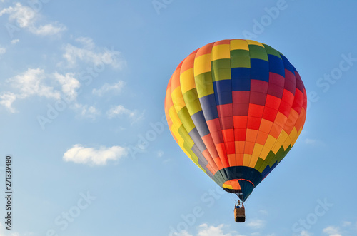 © kyrychukvitaliy, Naklejka premium Colorful hot air balloon heading up in blue sky. Copy space.