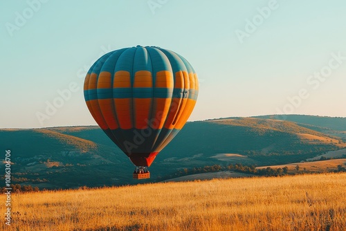 Fototapeta premium Colorful Hot Air Balloon in a Scenic Landscape During Sunset with Rolling Hills and Golden Wheat Fields Under a Clear Sky