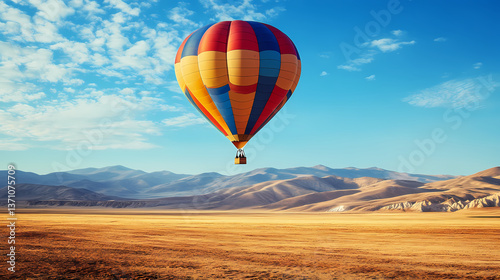 © Thiago, Naklejka premium Colorful hot air balloon in desert field, clear sky. travel photo. Crystalline Air. Illustration