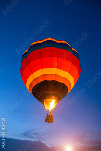 Obraz premium Colorful hot air balloon is flying at sunset