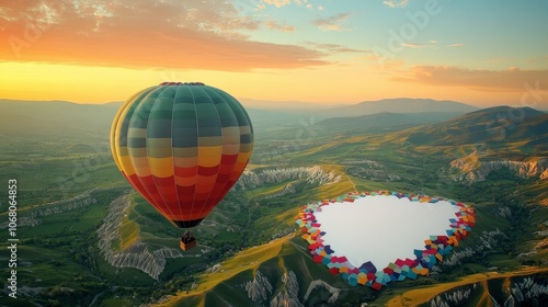 Fototapeta premium Colorful Hot Air Balloon Over Green Valleys at Sunrise