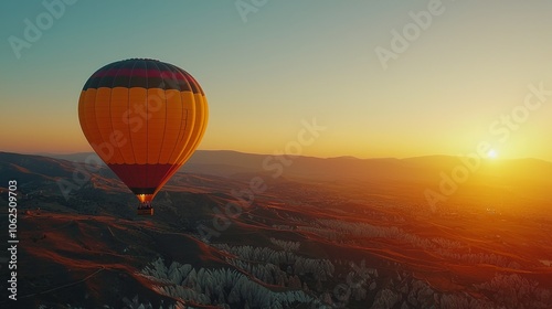 © Bandaro, Obraz premium Colorful Hot Air Balloon Over Scenic Landscape