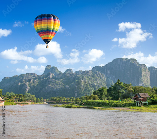 © littlestocker, Fototapeta premium Colorful hot air balloon over Song river Vang Vieng, Laos