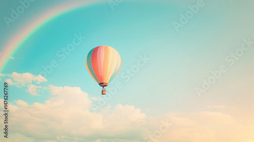 Naklejka premium Colorful hot air balloon soaring in a dreamy sky with a rainbow, symbolizing...