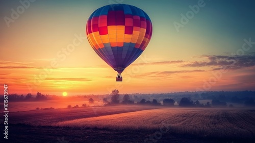 Fototapeta premium Colorful Hot Air Balloon Soaring Over Scenic Countryside at Sunset