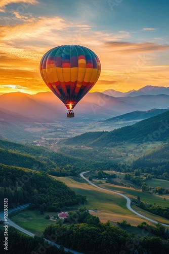 © Sunshine, Naklejka premium Colorful Hot Air Balloon Soaring Over Scenic Mountain Valley at Sunrise with Vibrant Sky and Rolling Hills