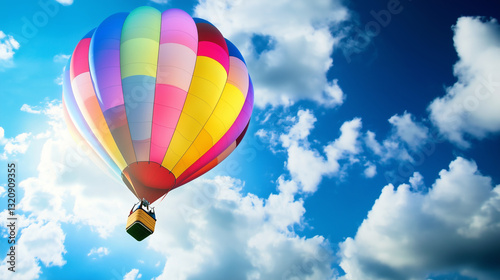 Naklejka premium Colorful hot air balloon soaring through a bright blue sky with fluffy white clouds, perfect for travel advertisements, inspirational posters, and adventure-themed marketing campaigns