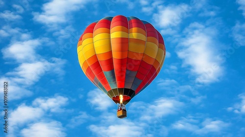 © Enggal Pitoyo, Obraz premium Colorful hot air balloon soars against a bright blue, cloudy sky.
