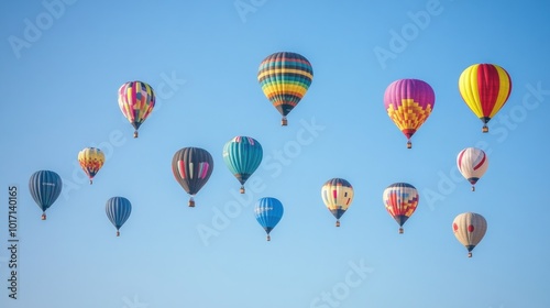 © Rere_Art151, Obraz premium Colorful Hot Air Balloons Ascending in a Clear Blue Sky