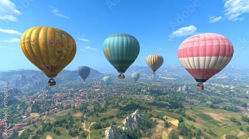 Fototapeta premium Colorful Hot Air Balloons Ascending Over Serene Cappadocia Landscape.