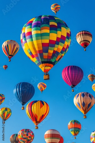 © ArtCookStudio, Fototapeta premium Colorful hot air balloons float above a vibrant crowd during a festival at dawn