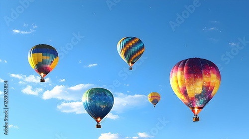 Fototapeta premium Colorful Hot Air Balloons Floating Against a Bright Blue Sky with White...