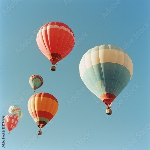 © Achirawee, Obraz premium Colorful hot air balloons floating against a clear blue sky, a dreamy summer spectacle.