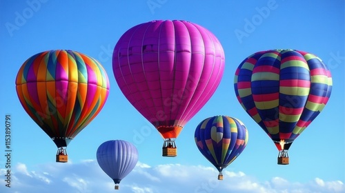 © Premium Illustration, Fototapeta premium Colorful hot air balloons floating gently, vibrant skies, travel adventure concept, perfect for travel blogs, summer festivals, vacation promotions, clear blue sky and clouds background bright mood