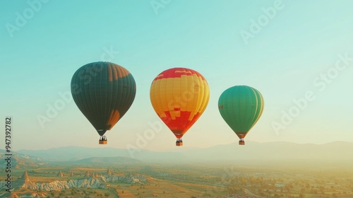 Fototapeta premium Colorful hot air balloons floating gracefully in a clear sky during sunrise,...