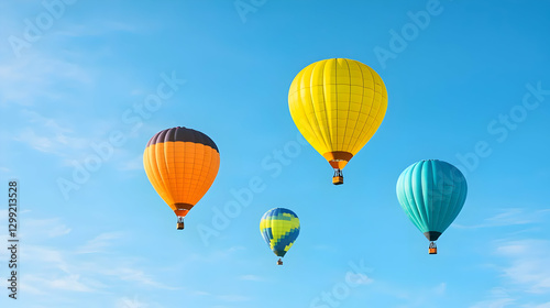 © artzone, Obraz premium Colorful Hot Air Balloons Floating In A Bright Blue Sky With White Clouds