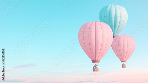 © Thamonchanok, Fototapeta premium Colorful hot air balloons floating in a clear blue sky, serene and picturesque.