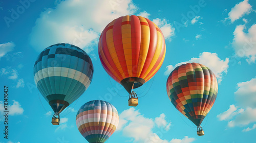 Fototapeta premium Colorful hot air balloons floating in blue sky. Adventure and exploration theme