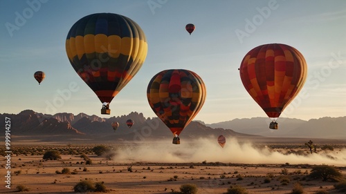 Naklejka premium Colorful Hot Air Balloons Floating Over a Desert Landscape sand dust tourism travel.