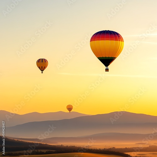 © jitthanant, Naklejka premium Colorful hot air balloons floating over a golden landscape, vibrant adventure
