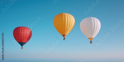 © Kamonwan, Obraz premium Colorful hot air balloons floating peacefully in a clear blue sky.