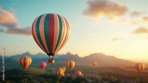 Obraz premium Colorful Hot Air Balloons Flying Above Scenic Mountain Landscape at Sunrise...