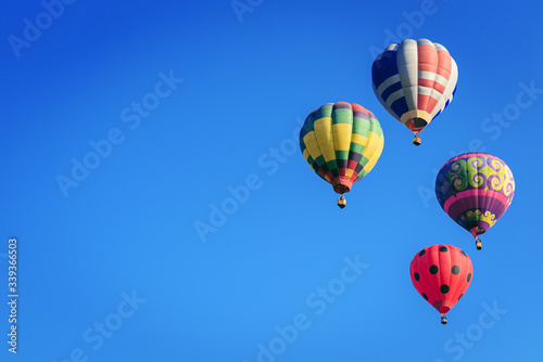 © jaboo_foto, Naklejka premium Colorful hot-air balloons flying in blue sky