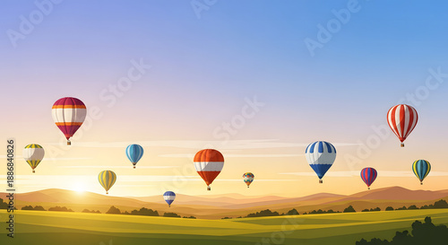 Obraz premium Colorful hot air balloons flying over green fields during sunris