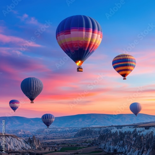 © Chanantorn, Obraz premium Colorful hot air balloons in sunset sky.