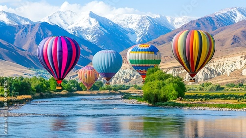 © Rosnani, Fototapeta premium Colorful hot air balloons over a scenic landscape.