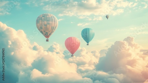 Naklejka premium Colorful hot air balloons soar above fluffy clouds at sunset; travel,...