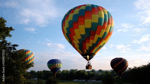 © kusuma ozora, Obraz premium Colorful hot air balloons soar over tranquil landscape