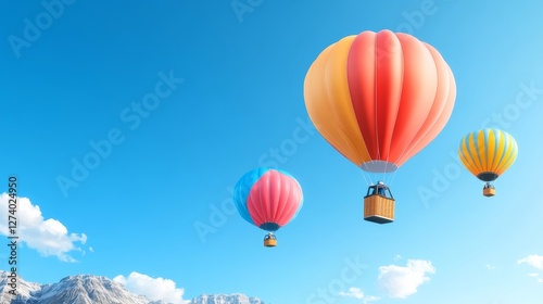 © AI Photo Stock, Fototapeta premium Colorful Hot Air Balloons Soaring Above Mountains - Three vibrant hot air balloons float gracefully against a clear blue sky