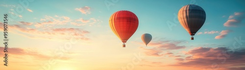 Naklejka premium Colorful hot air balloons soaring across a vibrant sky during sunset,...