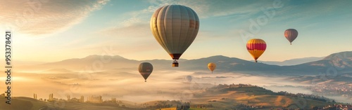 Naklejka premium Colorful hot air balloons soaring gracefully above a picturesque valley,...