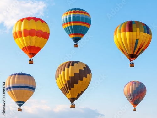 © Mnt, Obraz premium Colorful hot air balloons soaring in a clear blue sky.