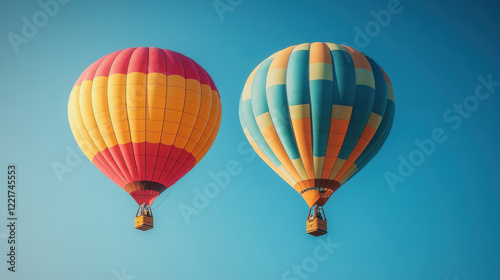 © Keopaserth, Naklejka premium Colorful hot air balloons soaring in clear blue sky create vibrant scene of adventure and freedom. bright colors evoke joy and excitement