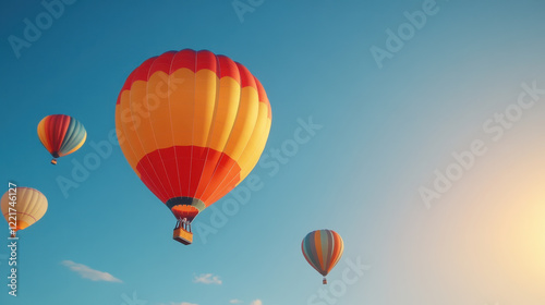 © Keopaserth, Obraz premium Colorful hot air balloons soaring in clear blue sky, creating vibrant scene of joy and adventure
