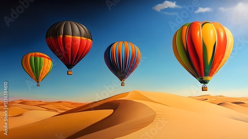 © Kwanhatai, Fototapeta premium Colorful Hot Air Balloons Soaring Over Desert Dunes Scenic Landscape
