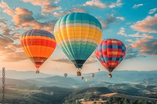 Fototapeta premium Colorful Hot Air Balloons Soaring Over Scenic Mountains at Sunset