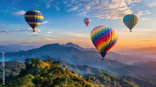 © pinporn manosri, Naklejka premium Colorful hot air balloons soaring over the majestic mountains of Doi Inthanon, Chiang Mai, Thailand. A breathtaking aerial view.
