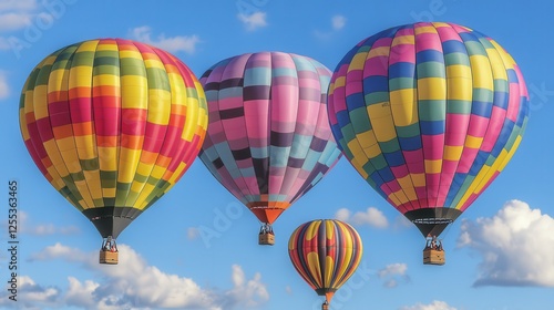 Fototapeta premium Colorful hot air balloons soaring, sunny sky, clouds. Travel poster