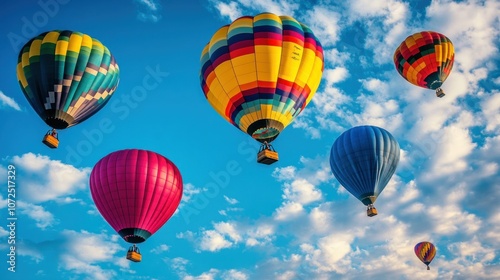 © rafa, Obraz premium Colorful Hot Air Balloons Soaring Through a Blue Sky With Fluffy White Clouds