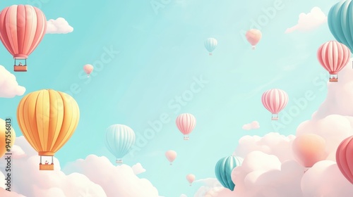 Fototapeta premium Colorful Hot Air Balloons Soaring Through Fluffy Clouds in a Dreamy Sky.